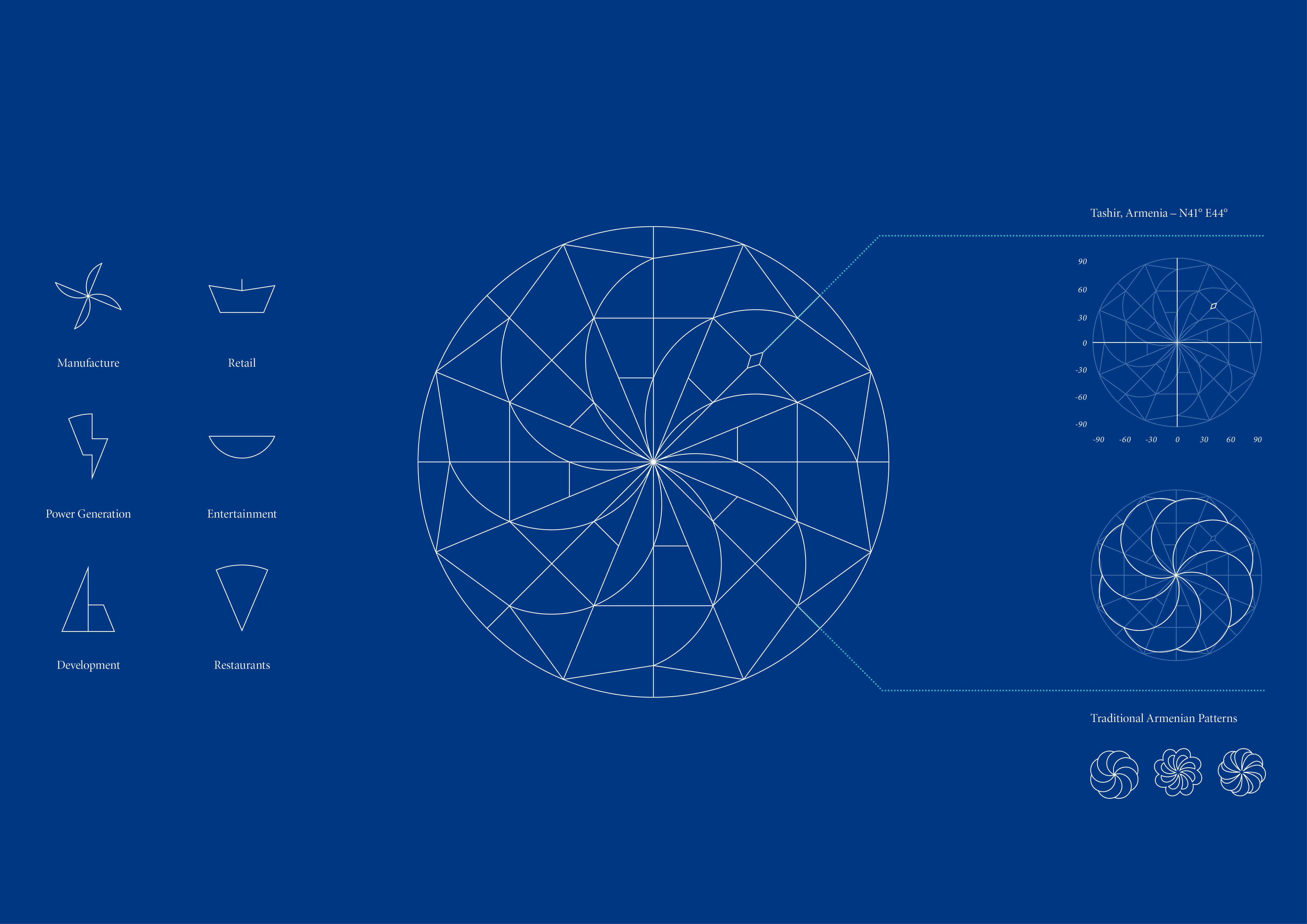 The new logo is an intricate multi-layered pattern, telling the story of Tashir Group’s past, present and future. At its base lie eight icons representing the eight core industries Tashir Group is active in today: development, finance, construction, manufacturing, energy, retail, restaurants and entertainment – a world full of opportunities. Connecting the angles, the base is covered by a circular pattern that is traditionally placed on Khachkars, Armenian cross stones. The sign of eternal life, it symbolises eternity and continuity – the element is mindful of the company’s heritage and reflective of its philosophy of stability and drive. The word mark that accompanies the symbol is based on a custom-built font with sharp diamond-inspired serifs.