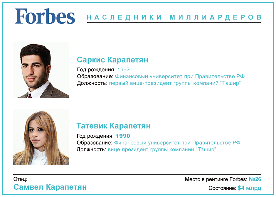 Примеров передачи бизнеса второму поколению в современной России пока мало. Однако многие наследники богатейших россиян готовятся стать преемниками. Forbes изучил, где работают дети первых 150 участников списка Forbes, среди которых дети президента и основателя группы компаний "Ташир" Самвела Карапетян