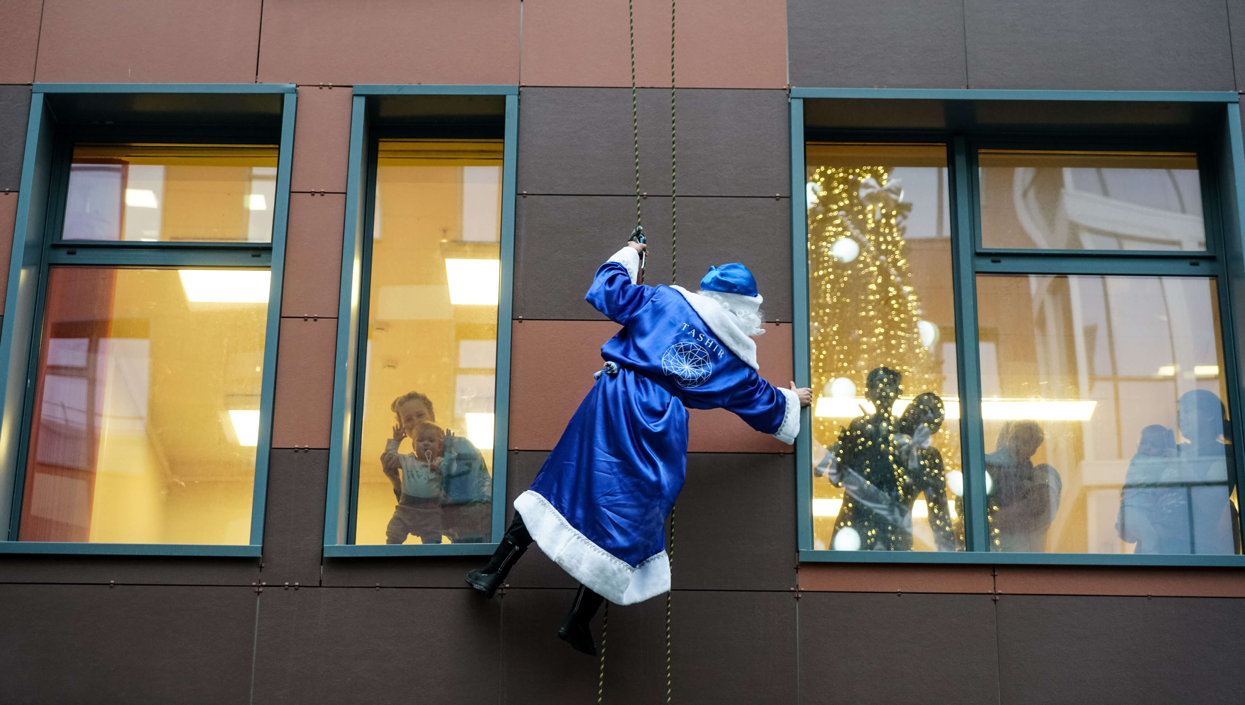 28 декабря 30 Дедов Морозов при помощи альпинистского снаряжения эффектно спустились с крыши Морозовской детской городской клинической больницы, чтобы, как в сказке, поприветствовать ребят, поздравить их с праздником и подарить подарки. В этом году “волшебники” появились в окнах как старого, так и нового корпусов.
