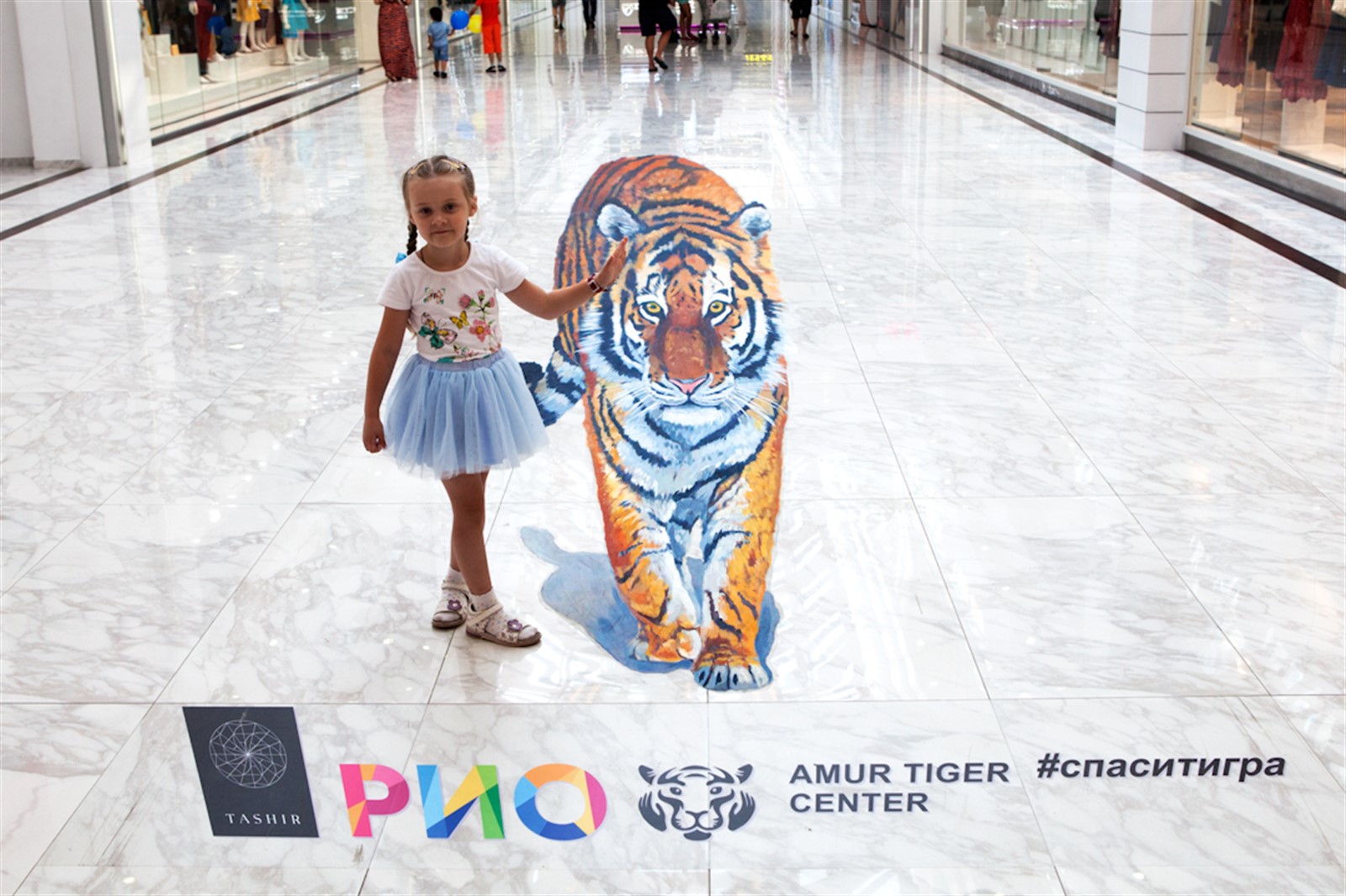 С конца июля и весь август под девизом «Спаси тигра» (#спаситигра) в популярных торговых центрах Москвы разместились трехмерные реалистичные рисунки животных, создающие ощущение присутствия хищника среди посетителей. Объемные изображения амурского тигра появятся в ряде столичных торгово-развлекательных центров «РИО» и Avenue South West