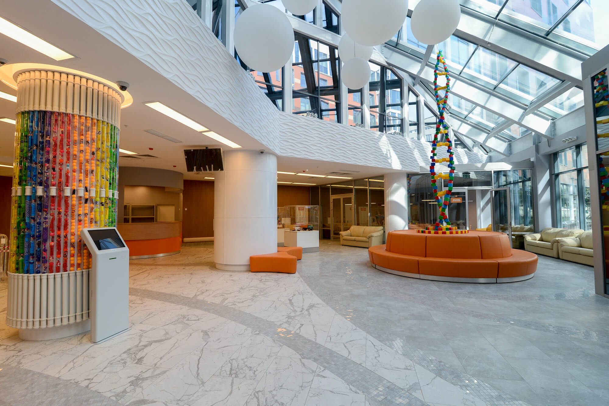 Новое здание лечебного корпуса состоит из приемного отделения с фильтр-боксами для поступающих пациентов на первом этаже и палат (одно- и двухместных), размещенных на втором ― седьмом этажах. Все палаты оборудованы так называемыми «тревожными кнопками» и усовершенствованной системой наблюдения за пациентами. Новый корпус спроектирован с учетом комфортного пребывания маленьких пациентов в условиях стационара. В частности, помимо специальных игровых зон в отделениях, на втором этаже выделена центральная верхняя игровая площадка с верхним витражным освещением. Палаты для детей до семи лет спланированы с учётом комфортного размещения с родителями.