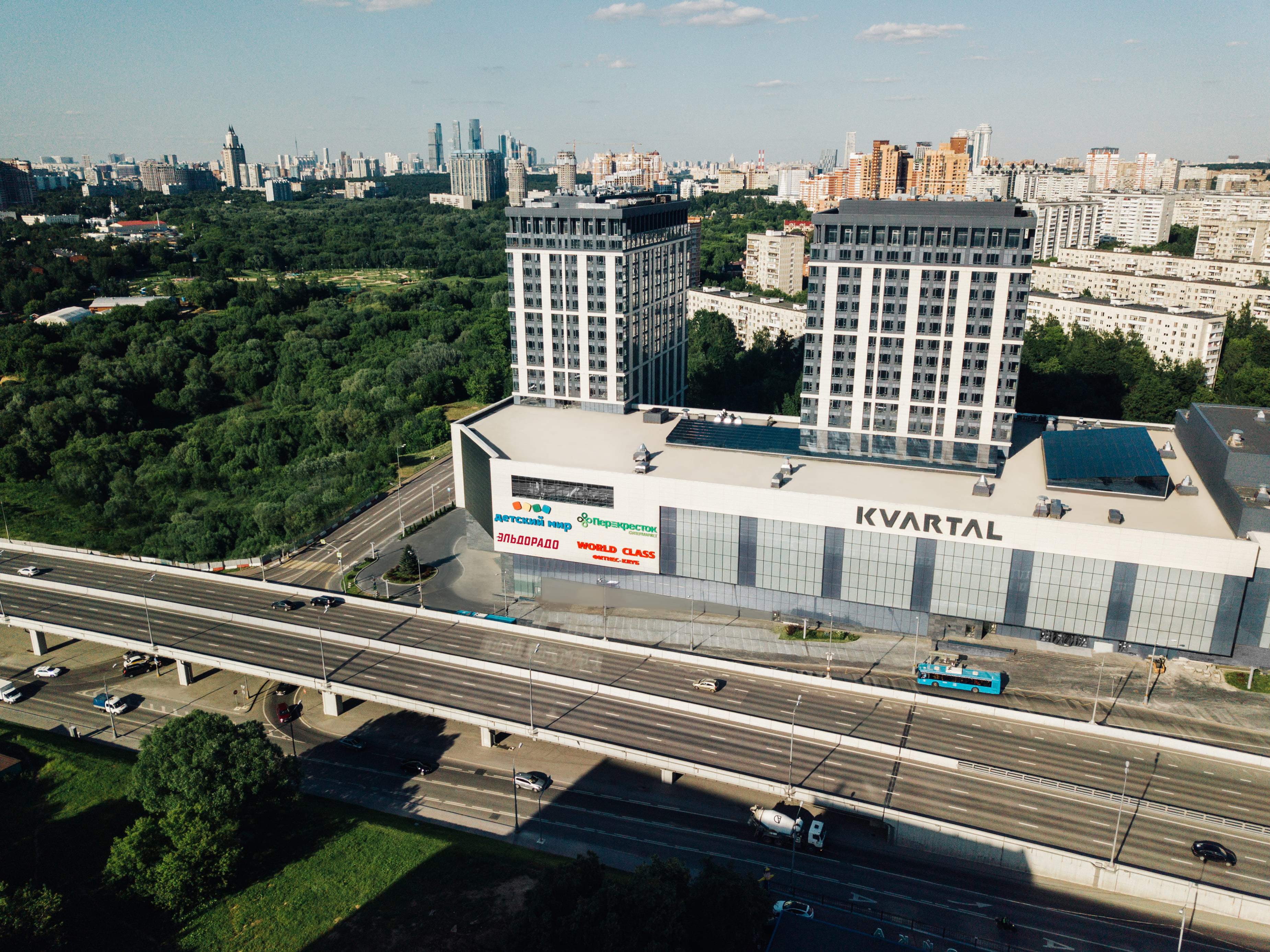 Концепция проекта подразумевает создание атмосферы «города в городе». В составе МФК: торговый центр, офисные и жилые пространства, развлекательные и досуговые форматы, центр для занятий спортом, объекты общественного питания и подземная парковка. Комплекс общей площадью около 140 000 кв. м включает в себя 6-этажный торговый центр, две 22-этажные башни и 3-х уровневую подземную парковку на 1000 машиномест. Торговое пространство Kvartal WEST занимает 70 тыс. кв. м, бизнес-центр — 18 тыс. кв. м, апартаменты — 24 тыс. кв. м. Все части комплекса будут соединены между собой проходами.